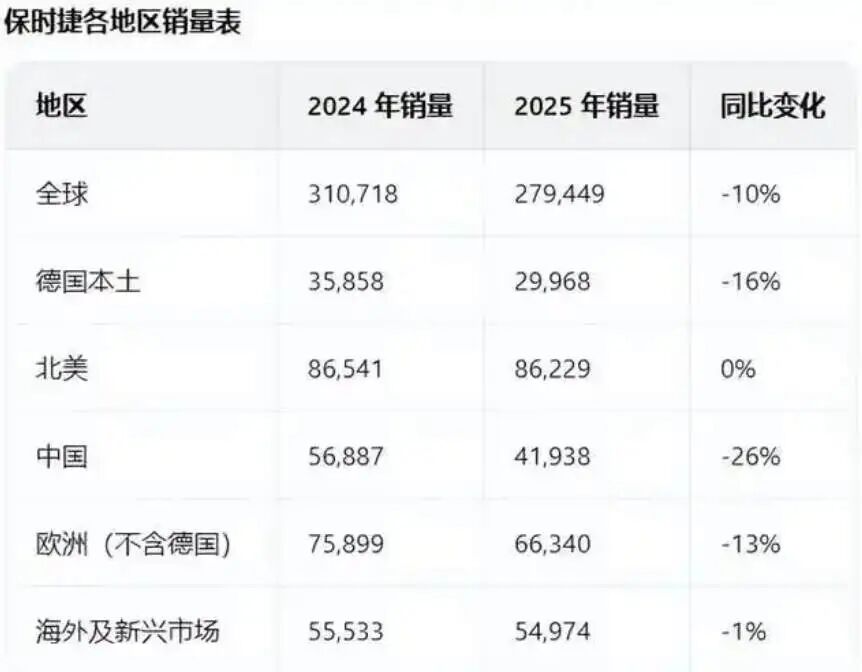 中国市场的变化则是最激烈的,2025年保时捷的在华销量只有大约4.2万辆,和2024年相比下滑了26%。