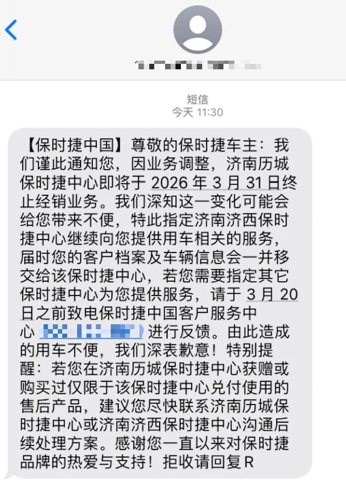 无独有偶,在发布会结束的几天之后,3月17号许多身处济南的保时捷车主,都收到了一则为济南的历城保时捷中心将会在2026年3月31号停止运营的消息。