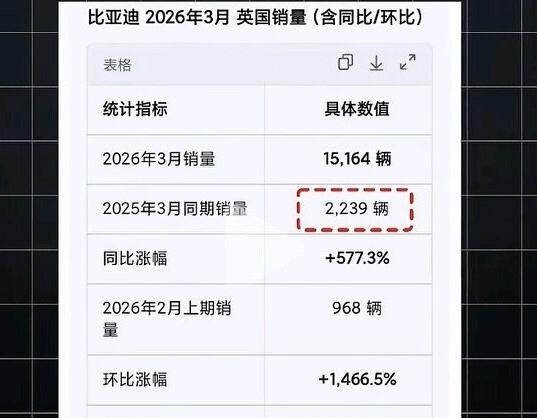 “不到半个月,加满一个取暖油罐的费用已经翻了一倍。”英国消除燃料贫困联盟的西蒙·弗朗西斯在接受采访时说的这句话,大概能解释为什么现在英国人排队买的不是炸鱼薯条,而是中国车。这个曾经发明了蒸汽机的国度,如今正在为一辆辆贴着BYD标志的汽车疯狂。3月份的数据直接把所有人看傻了——比亚迪在英国卖出15164台新车,而去年这个时候只有2239台,暴涨1466%。你没看错,不是146%,是1466%。