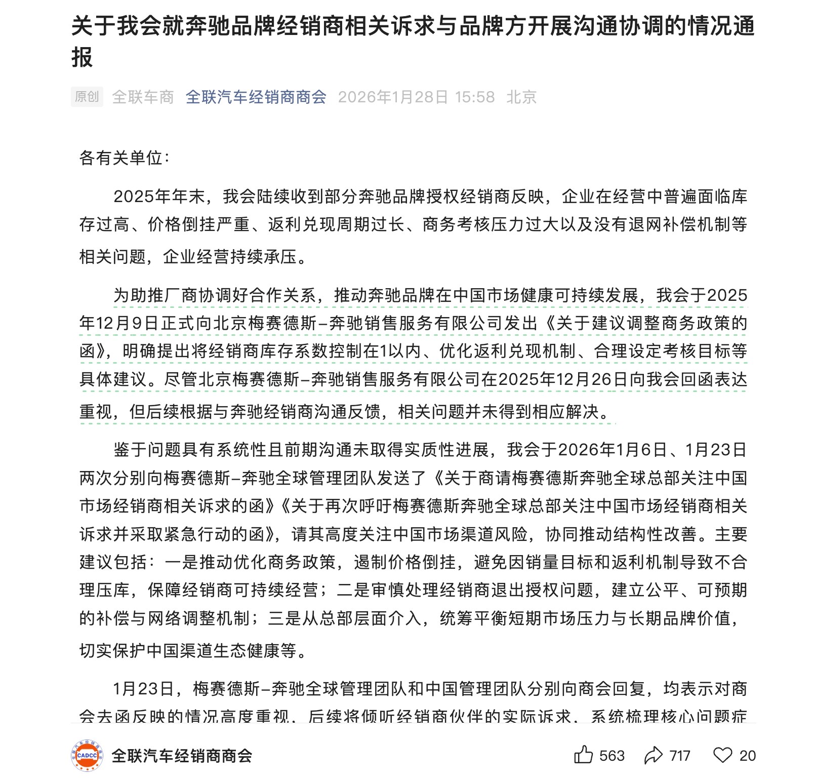 1月28日,当梅赛德斯-奔驰全球团队庆祝品牌诞生140周年时,中国市场的合作伙伴却送上了一份意外“礼物”。全国工商联汽车经销商商会发布《关于我会就奔驰品牌经销商相关诉求与品牌方开展沟通协调的情况通报》,直指奔驰与经销商关系中存在的多个问题。