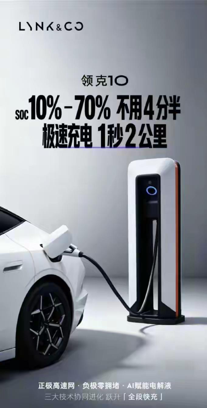 2026年4月7日晚,吉利旗下领克品牌举办了“领克10+&领克10全球首秀暨三电技术发布会”。在这场发布会上,吉利抛出了一组更快的数字:搭载900V平台和95度神盾金砖电池的领克10,在配套的极氪V4兆瓦闪充桩上,电量从10%充到70%仅需4分22秒,充到97%仅需8分42秒。对比比亚迪的5分钟和9分钟,吉利在10%-70%这个关键区间快了38秒,在10%-97%区间快了18秒。吉利将这一成绩称为“全球量产充电速度最快”,并宣传其峰值充电功率可达1100千瓦,能实现“1秒极充2公里”。