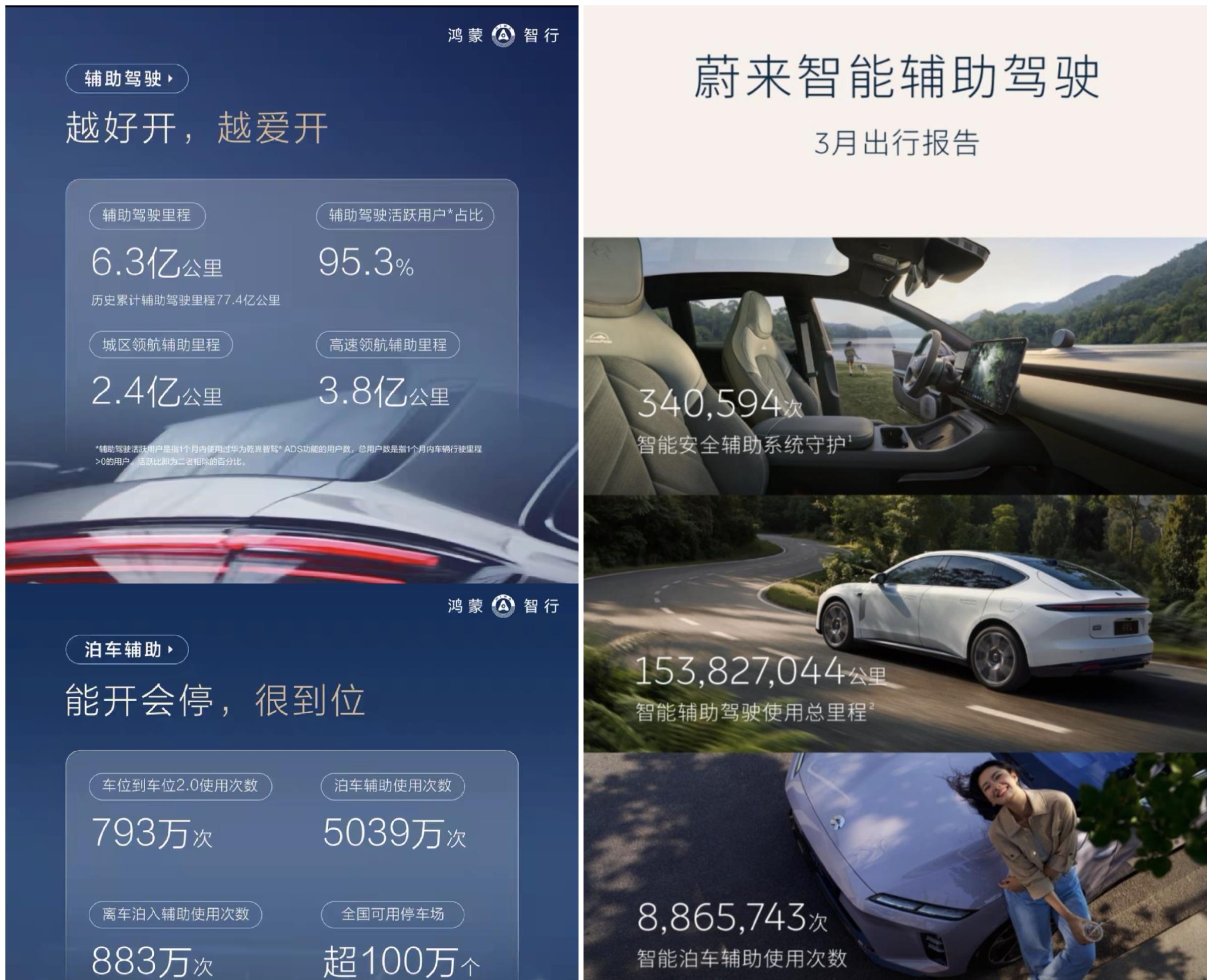 蔚来这边三月交出的成绩单是这样的:存量车110万台左右,整个月智驾总里程1.5亿公里,辅助泊车886万次。鸿蒙智行呢?存量车大概130万台,智驾总里程干了6.3亿公里,辅助泊车直接破5000万次。算一下就知道,每台蔚来车平均一个月智驾跑了136公里,鸿蒙智行那边是484公里,差了3.5倍。泊车次数差距更夸张,蔚来每车每月8次,鸿蒙那边38次,差4.7倍。