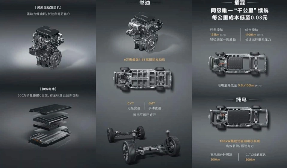 真正体现五菱“螺蛳壳里做道场”本事的,是它提供的三种动力菜单。燃油版1.5T参数不错,主打一个直接可靠;纯电版续航500公里支持快充,城市代步零成本;而最值得细品的,是它的插混版。纯电125公里能满足几天通勤,综合续航1100公里彻底根治里程焦虑。