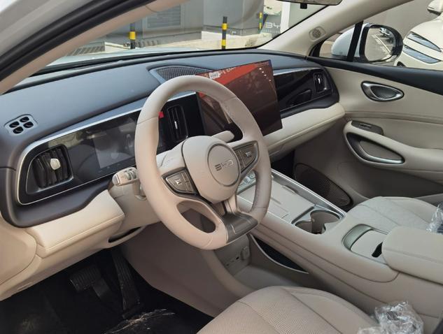 屏幕也升级了。15.6英寸的悬浮大屏,内嵌式8.8英寸仪表,配上最新的DiLink系统,流畅度应该不差。内饰颜色给了杏仁米和暮色蓝两种,比老款的深色系年轻了不少。