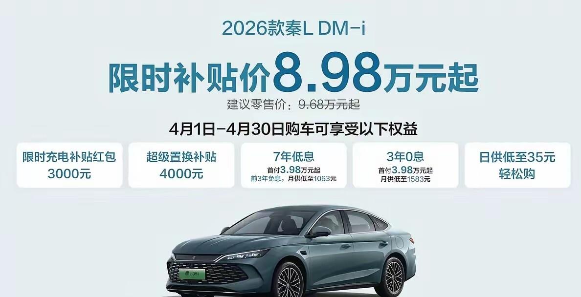 就在这几天,车友群里彻底炸开了锅。比亚迪王朝网销售的朋友圈画风突变,从之前的“等等,好车不怕晚”变成了“手慢无,错过等一年”。拿那款刚上市没多久的2026款秦L DM-i来说,原价9.68万起,4月份限时补贴价直接干到了8.98万起。别急,这还没算完,在这个基础上还白送你3000块的充电补贴和4000块的置换补贴。里外里一算,这哪里是买车,简直就像是在批发大白菜。虽然比亚迪内部人士嘴硬说这只是“把之前的权益量化了”,算不上真降价,但咱们老百姓看的是啥?是落到口袋里的实惠。不管你叫补贴还是叫红包,原本要花小十万才能开走的车,现在九万以内就能落地,这就是实打实的真金白银。