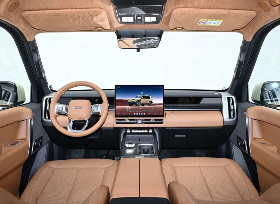 车身长宽高5055/1976/1894mm,轴距2910mm,空间宽敞,5门5座布局,日常载人、放户外装备都无压力,24.5°接近角、600mm最大涉水深度,越野通过性也很出色。配置上诚意拉满,星舰座舱布局,15.4英寸中控屏+8.88英寸液晶仪表,全系标配高通8295P芯片,语音助手支持四音区识别,还能实现人车家互联,标配座椅加热通风、无线充电等实用配置,智驾配置也很全面,顶配可选激光雷达,智驾实力远超同级别竞品。