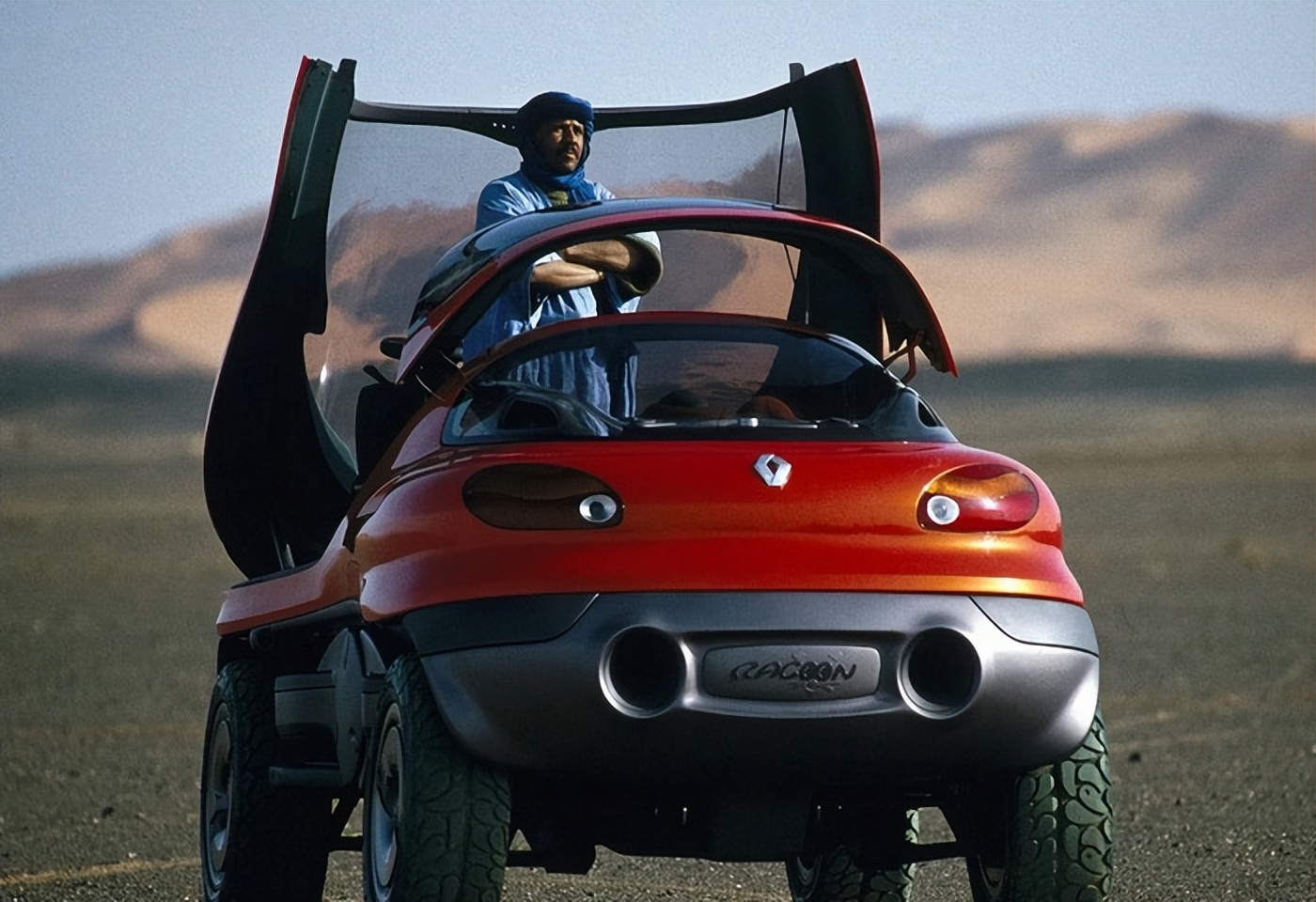 三座的雷诺浣熊(Renault Racoon)由法国设计师帕特里克·勒奎蒙(Patrick Le Quément)于1992年设计。这款车在当时拥有诸多超前的功能——包括电脑控制系统、卫星导航、倒车影像和防雨玻璃。