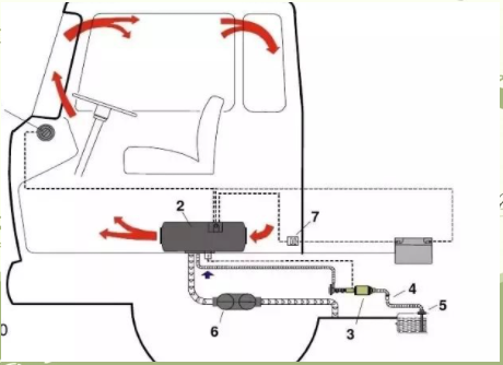 首先,燃油通过油泵被送入燃烧室,在那里经过蒸发和雾化处理。同时,自助燃空气从进口吸入,与燃油混合后进行燃烧。燃烧过程中产生的废气则通过排气口排出。此外,电机驱动的风扇会吸入冷风,经过热交换器时吸收燃烧释放的热量,最终转化为暖风从出风口吹出,为发动机和驾驶室提供所需的温暖。
