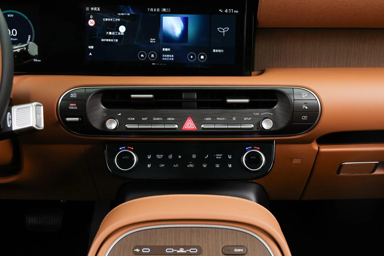 动力部分变化很大,原先的大排量自吸发动机+8AT的动力组合被全新的油电混合动力所代替,值得一提的是,现代的油混方案跟日系的油混方案不太一样,这套混动系统由Smartstream 2.5T涡轮增压发动机与P1+P2双电机+一块小电池组成。发动机用的是大排量的涡轮增压系列,单发动机部分的功率就达到了192.7千瓦(262马力),峰值扭矩353牛·米,用来直驱车辆不费劲;P2驱动电机54千瓦,扭矩264牛·米,这套动力的综合输出功率达246千瓦(334马力),峰值扭矩460牛·米,相当于3.0 V6涡轮增压发动机的动力,驱动性能较前代提升19%,且燃油效率提升33%,油耗进一步降低,只有6.97升/百公里,四驱版本也才7.84升/百公里。