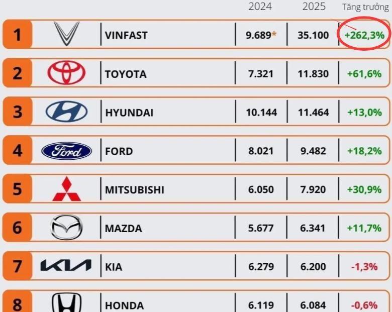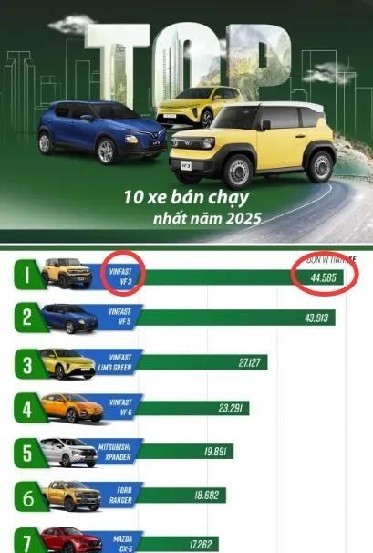 先来看一组让日系车集体沉默的数据。2025年全年,越南汽车市场彻底变天了。VinFast这家越南本土电动车企,一口气交付了175099辆汽车,比前一年翻了一倍还多,直接把丰田、现代、福特三家传统豪强的销量全部压了下去。更要命的是,在越南年度最畅销车型的榜单上,VinFast VF 3以44585辆的成绩拿下第一名,紧随其后的VF 5卖了43913辆,连2025年8月才上市的Limo Green都冲到了第三名,卖了27127辆。也就是说,前十名里有四款是VinFast的电动车,而且包揽了冠亚军。