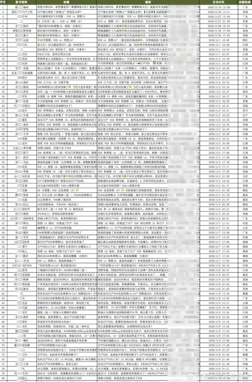 NX8的产品力本有可圈可点之处:增程版CLTC纯电续航310公里,综合续航1450公里,亏电油耗4.51L/100km且可加92号油,优于理想L6的对应数据,上市半小时订单便破8423台,开局看似亮眼。但日产的营销操作却彻底砸了招牌:上市后,社交媒体上突然涌现大量标题一致的内容,清一色吹捧NX8、贬低理想i6和L6,评论区被空白账号复制粘贴式刷屏;李想更是曝光,日产内部培训材料明确写着“向上对标理想,增程替代燃油”,甚至专门要求输出NX8与理想i6的对比表格,一场谋划周密的拉踩战昭然若揭。