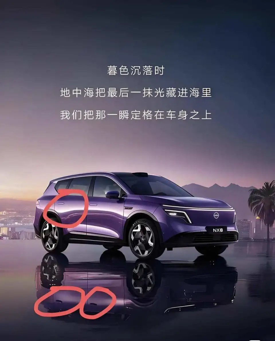 NX8上市前就已爆发“海报抄袭门”。4月1日,小红书账号“蚂蚁视觉”公开指控,NX8的广告图直接抄袭其2025年为极氪9X、尚界H5制作的创意,甚至海报水面倒影暴露的传统机械门把手、分体大灯,与NX8实车的隐藏式门把手、贯穿式日行灯不符,证实是直接套图修改。一款号称“转型扛鼎之作”的旗舰SUV,连宣传物料都靠抄袭,背后是日产团队对原创的轻慢和研发底气的缺失。