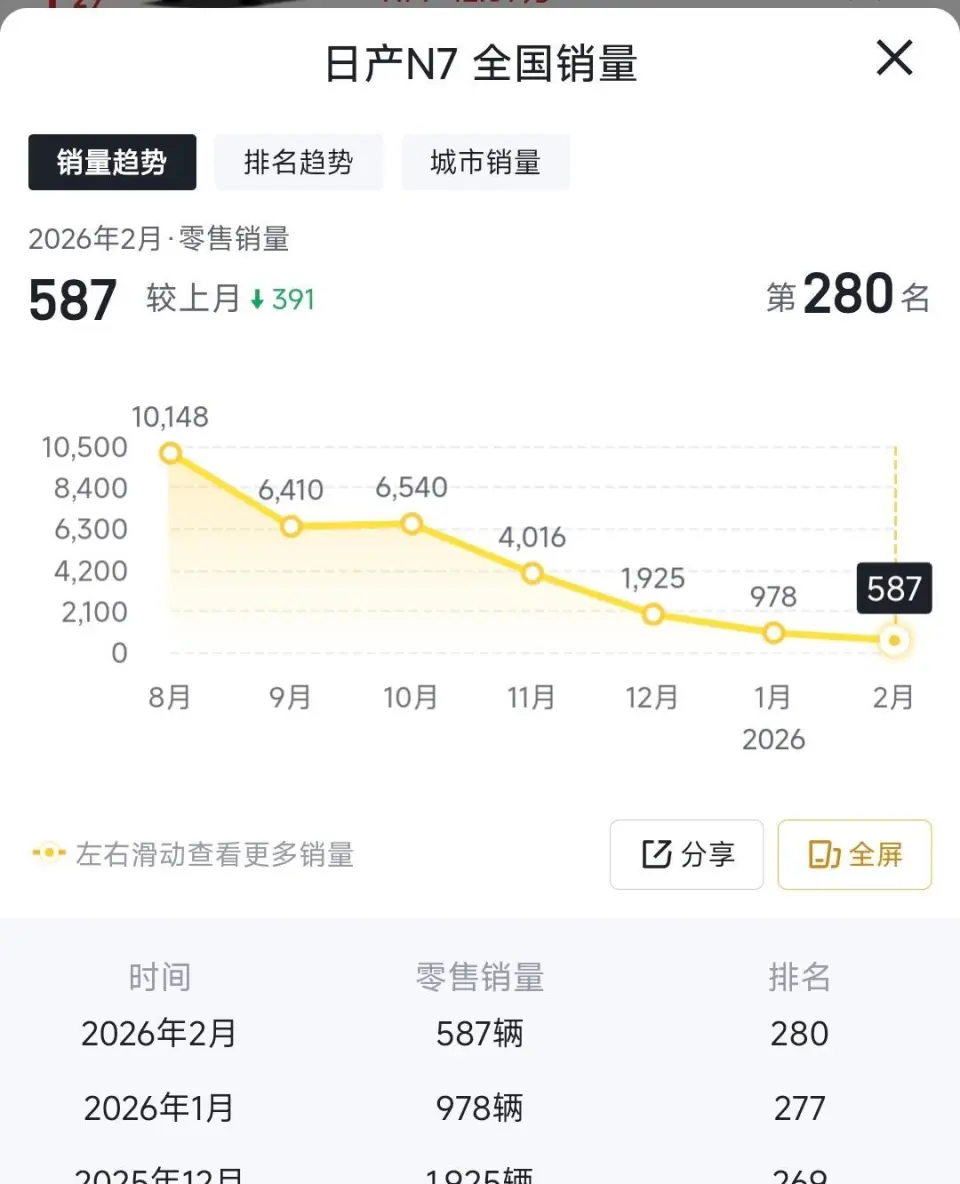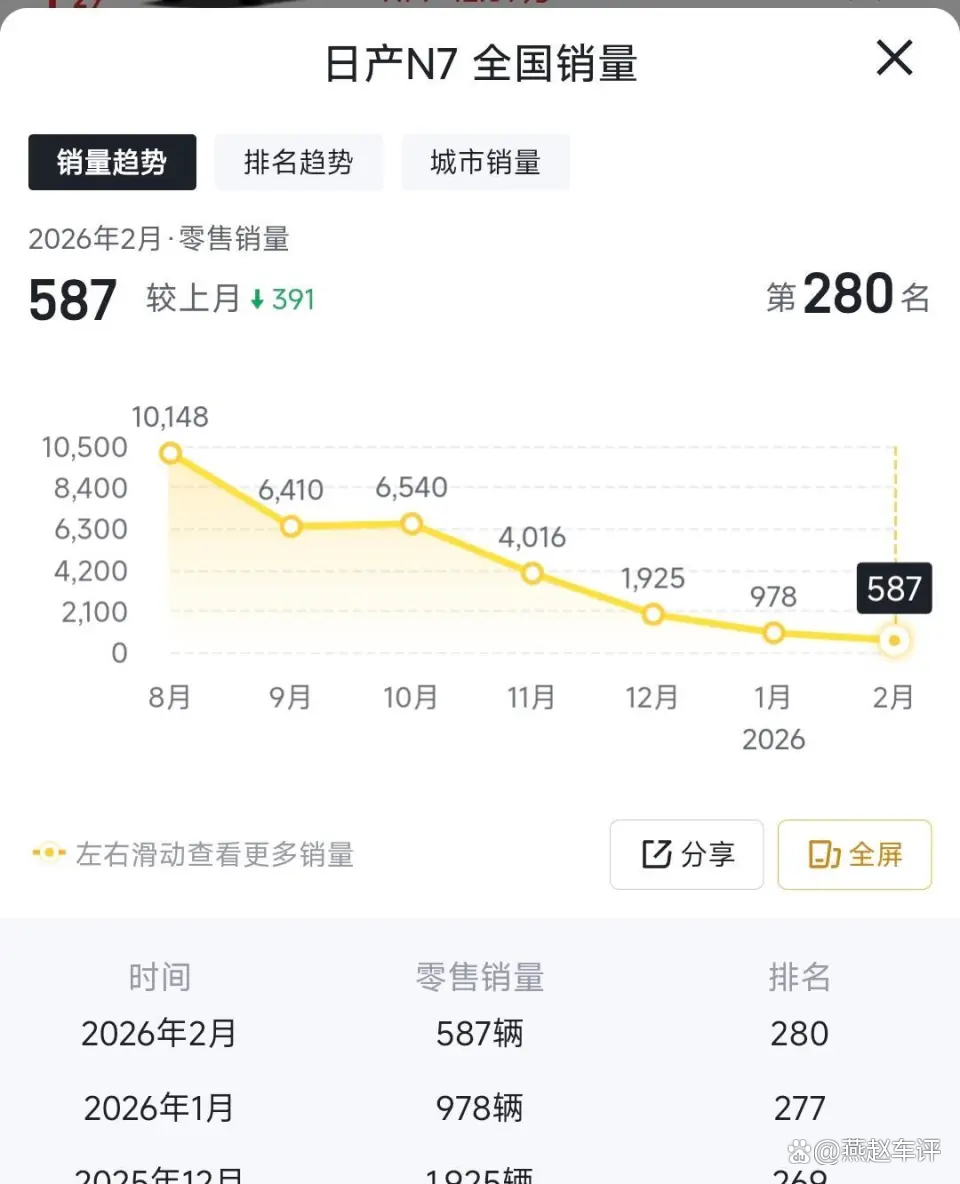 李想的暴怒绝非偶然。理想i6作为理想今年销量的绝对支柱,3月单月交付2.4万辆,占理想当月总销量4.1万辆的近六成,4月10日更是迎来第10万辆量产车下线,从交付到破10万仅用不到7个月,刷新了20-30万元纯电SUV最快交付纪录。反观日产,处境早已岌岌可危:2025年全年销量仅60.09万辆,同比下滑20%;2026年2月销量同比暴跌48.88%,腰斩至1.6万辆,创近9年最差纪录,轩逸、天籁等主力车型销量下滑,新能源车型N7、N6更是跌至月销三位数。辛宇的回归本是“救火”,却用错了方向。