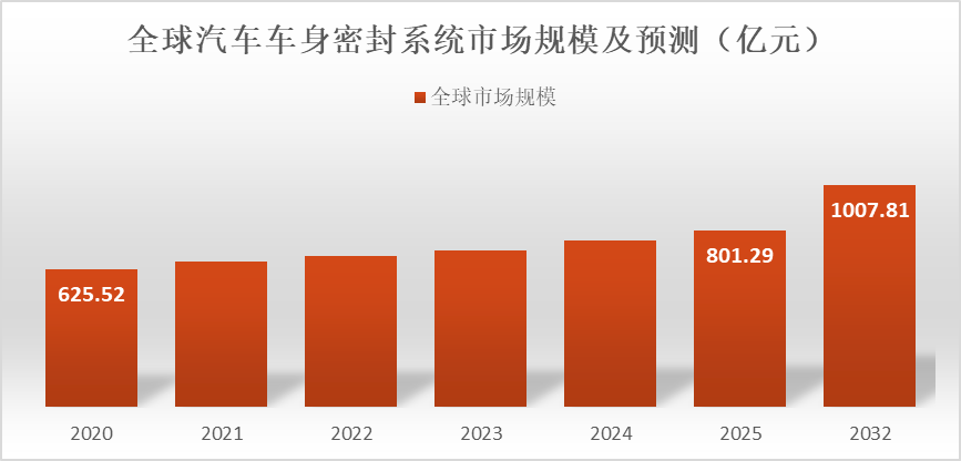 根据问可汇(WENKH)深度研究分析,2025年全球汽车车身密封系统的市场规模达到801亿元。汽车产业持续扩张带动车辆产量提升,对车身密封系统形成基础需求。新能源汽车普及带来特殊防护需求,推动专用密封解决方案研发。消费者对车辆舒适性、隔音降噪及安全性的要求不断提高,促使厂商升级密封技术。环保与能效法规日趋严格,倒逼企业采用轻量化、高性能密封材料,技术创新与市场需求升级共同推动行业规模扩大。未来预计以3.33%的年复合增长率增长至2032年的1008亿元。