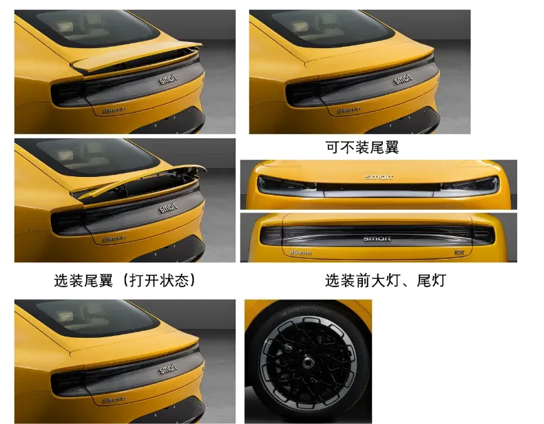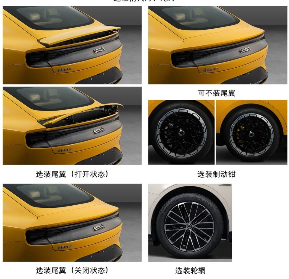 尺寸上,它比SU7略短一些,但轴距也达到了2926mm,空间值得期待。它提供的选装件非常“玩味”,从不同样式的扰流板到彩色刹车卡钳,摆明了告诉年轻人:个性化,我懂你。如果说小米SU7是标准答案式的“理工男帅气”,那smart精灵#6 EHD则多了几分时尚圈的“潮男定制感”。