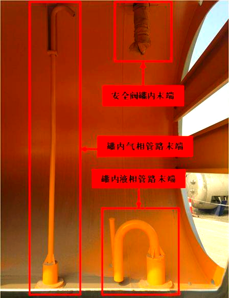通过查看图文—13所展示的LPG运输车罐体内部结构图,我们可以清晰地看到气相管路的末端被精心布设在罐体的上部,也就是气相空间内。同样,液相管路的末端则被安置在罐体的下部,即液相空间。而安全阀的末端则设置在罐顶的气相空间中。值得注意的是,当事故车辆处于不同的位置状态时——无论是正常状态、侧翻还是翻扣——罐内的液、气相空间都会发生相应的变化,进而导致液、气相管路末端的位置也会随之改变。