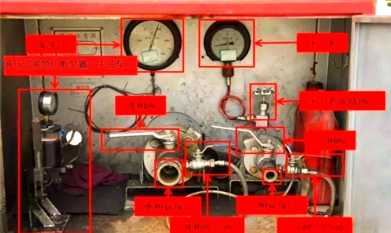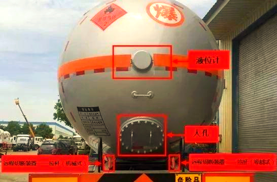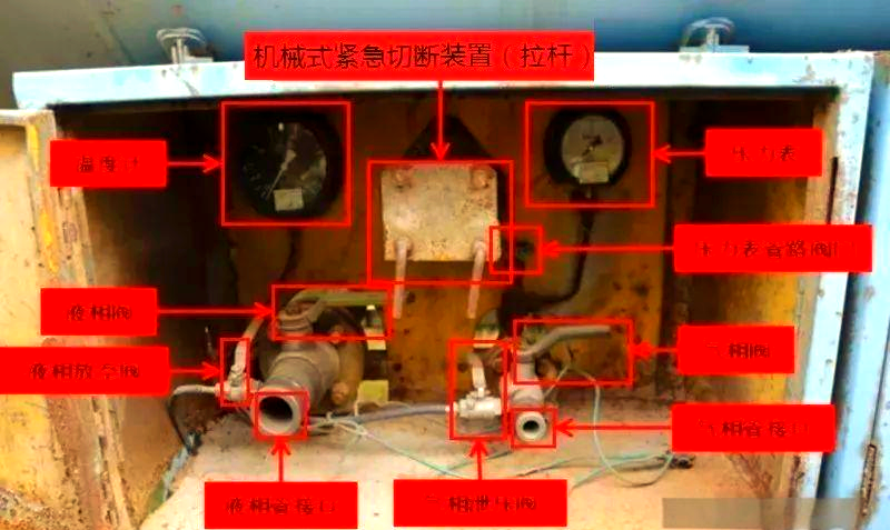 这样,即便车辆发生侧翻,仍有一侧的操作箱能够进行泄压和输转导罐操作。此外,在车体尾部,还设置了远程切断装置,包括机械式的拉杆和液压式的泄压阀。当进行装、卸作业时,若操作箱(装卸系统)内的液、气相管路发生脱落、泄露等紧急情况,且技术人员无法靠近时,可迅速前往车体尾部,通过操作远程切断装置(拉杆或泄压阀)来关闭紧急切断阀,从而有效防止罐内介质的大量外泄。特别需要留意的是液压油管路的工况,以确保液压式紧急切断阀能够正常开启,避免因液压油不足、管路破损或构件损毁等问题导致阀门无法正常工作。