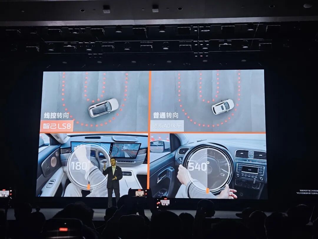 除了搭载恒星增程、做出大空间之外,智己LS8真正用来拉开差距的是“下放”线控转向技术。