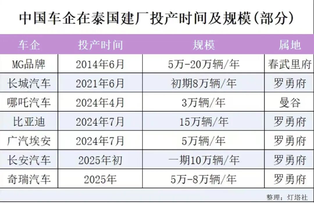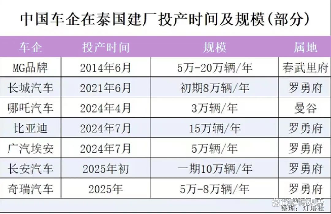 近年来,随着全球汽车产业的转型与新能源汽车的迅猛发展,中国车企纷纷将目光投向了充满机遇的泰国市场。截至目前,已有七家中国车企在泰国建立工厂,实现从规划、生产到销售的闭环,分别是比亚迪、上汽名爵、长城汽车、广汽埃安、长安汽车、奇瑞汽车及哪吒汽车。