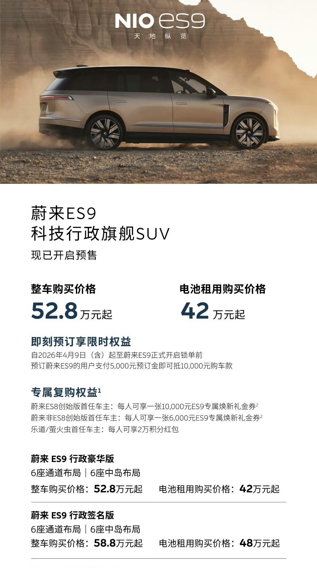 从4月9日开启预售后,预订用户支付5000元预订金可以抵扣10000元购车款。蔚来也为老用户提供了专属的复购礼遇,例如ES8创始版首任车主可获得10000元的ES9专属焕新礼金券。这些营销策略,旨在第一时间锁定核心粉丝和增换购用户。