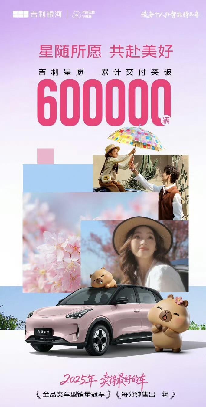 但真正让星愿和用户粘在一起的,其实是吉利那套“银河式宠粉”的玩法。从上市初期到店看车送哈根达斯冰淇淋,到在哈尔滨松花江上搞冰雪嘉年华,再到大凉山给孩子们修篮球训练场。这次60万辆达成,又跟萌宠IP“卡皮巴拉小黄豚”搞跨界合作,60万老车主可以在银河APP上抽卡皮巴拉盲盒。你品品这个路子,它不是光让你买完车就完事儿了,而是不停地用各种小惊喜让你觉得这车买得值。