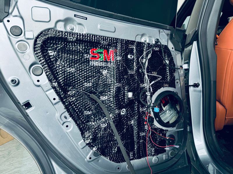 施工时,师傅先把车门内层钣金彻底清洁干净,满铺超绿人环保止振板,用滚轮反复压实,从根源抑制钣金振动,阻断风噪和路噪的传导;接着在车门外层再满铺一层止振板,形成双层密封屏障,让车门变成扎实的“静音箱体”,最后还做了细节密封,把噪音牢牢挡在车外。
