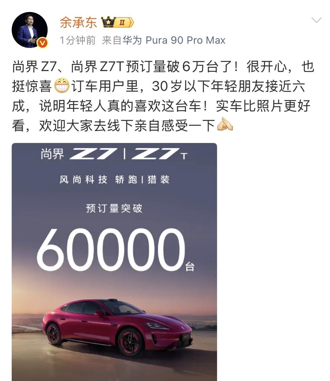 余承东又在深夜放了一颗“炸弹”。就在4月12日,鸿蒙智行官宣了一个数字:尚界Z7和Z7T,累计小订突破了6万台。他晒出这个成绩单的时候,用了“很开心,也挺惊喜”这六个字。说实话,放在别的品牌身上,新车预售能拿到6万订单,那估计得开香槟庆祝。但这可是余承东,是那个动不动就把“遥遥领先”挂嘴边的男人。于是问题就来了:在24万这个修罗场一般的价格区间里,6万台究竟算是“杀疯了”,还是只能算“及格线”?