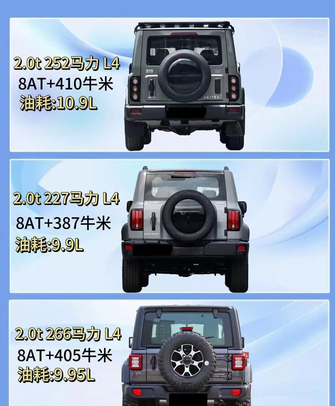 再说油耗。这一点,我相信开过柴油越野车的人都深有体会。BJ40柴油版的公告油耗是9.97L/100km,实际开下来很多人跑到8升出头,一箱油能跑1000公里-。212 T01柴油版同样不差,百公里油耗8.5升,配合80升的大油箱,续航接近1000公里。坦克300柴油版的预估综合油耗在8到9升之间-。这意味啥?你从北京跑到阿拉善英雄会,中间不用进一次加油站。那些纯电越野车,实际续航300到400公里,到了低温或者重度越野场景还要大幅缩水,在无人区你找谁给你拉充电桩去?