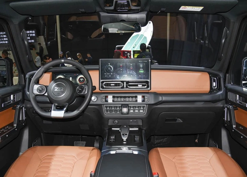 先看看这副“硬汉骨架”。212 T01长风柴油版,从名字到造型都写着“不服输”。重新设计的发动机盖带着隆起的通风口,加宽的中网气势十足。它不像牧马人那样追求极致的复古圆形大灯,而是在经典方盒子造型上,融入了更现代的线条。原厂就给配了高达43度的接近角和36度的离去角,最小离地间隙256mm,特别是850mm的原厂涉水深度,这些数据一亮,明眼人就懂了:它生来就是为了碾过那些铺装路的尽头。和坦克300相比,它少了一丝时尚精致,多了一分纯粹的工具属性和为野外而生的功能化设计,风格更粗犷、更直接。