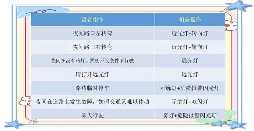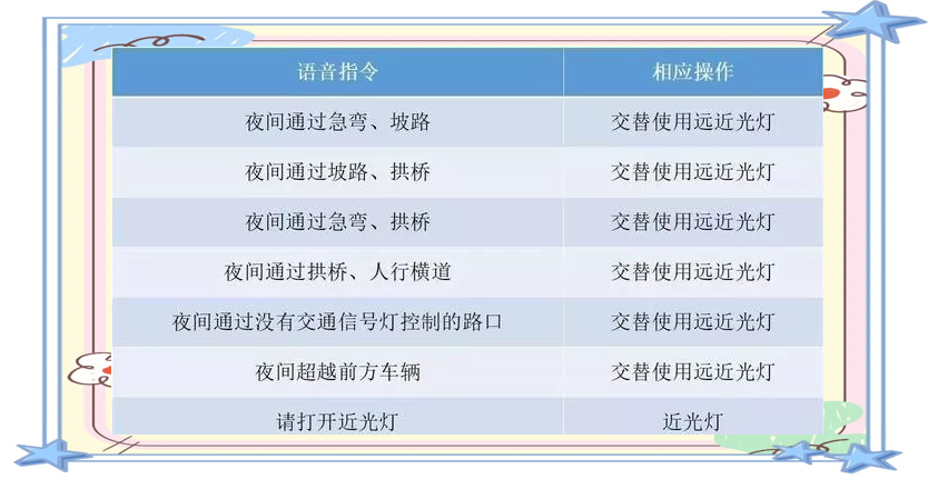 在听到灯光语音指令后,需在5秒内迅速且准确地完成相应的灯光操作。请注意,每条指令的执行都必须在语音播报结束后的5秒内完成,否则将直接导致考试不合格。