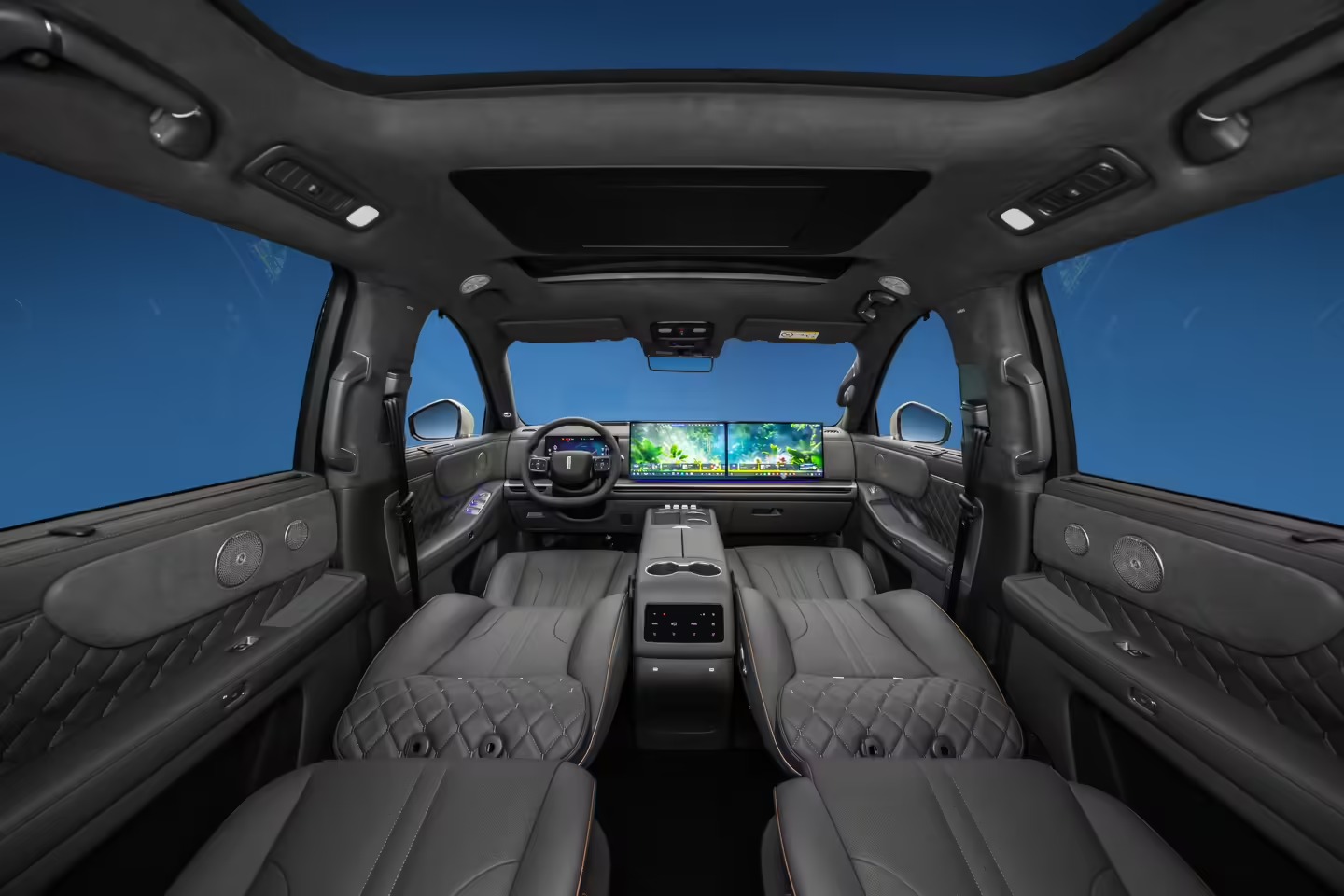 前排双17.3英寸屏加后排21.4英寸吸顶屏,这是常规操作;31扬声器3080W功率的Coffee AI Sound音响,8个头枕音响,这是诚意。