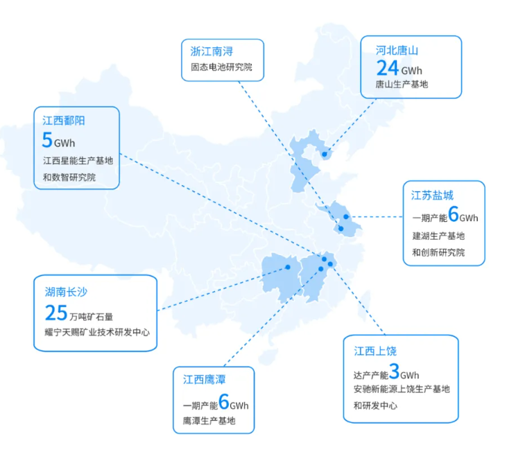 2022年,耀宁新能源通过收购安驰科技部分股权全面布局工业储能、通信储能和车用高压动力电池三大领域,形成湖南岳阳研发中心与生产基地、江苏建湖创新中心与生产基地、江西上饶安驰科技、上海数字能源研发中心及湖南平江材料基地。