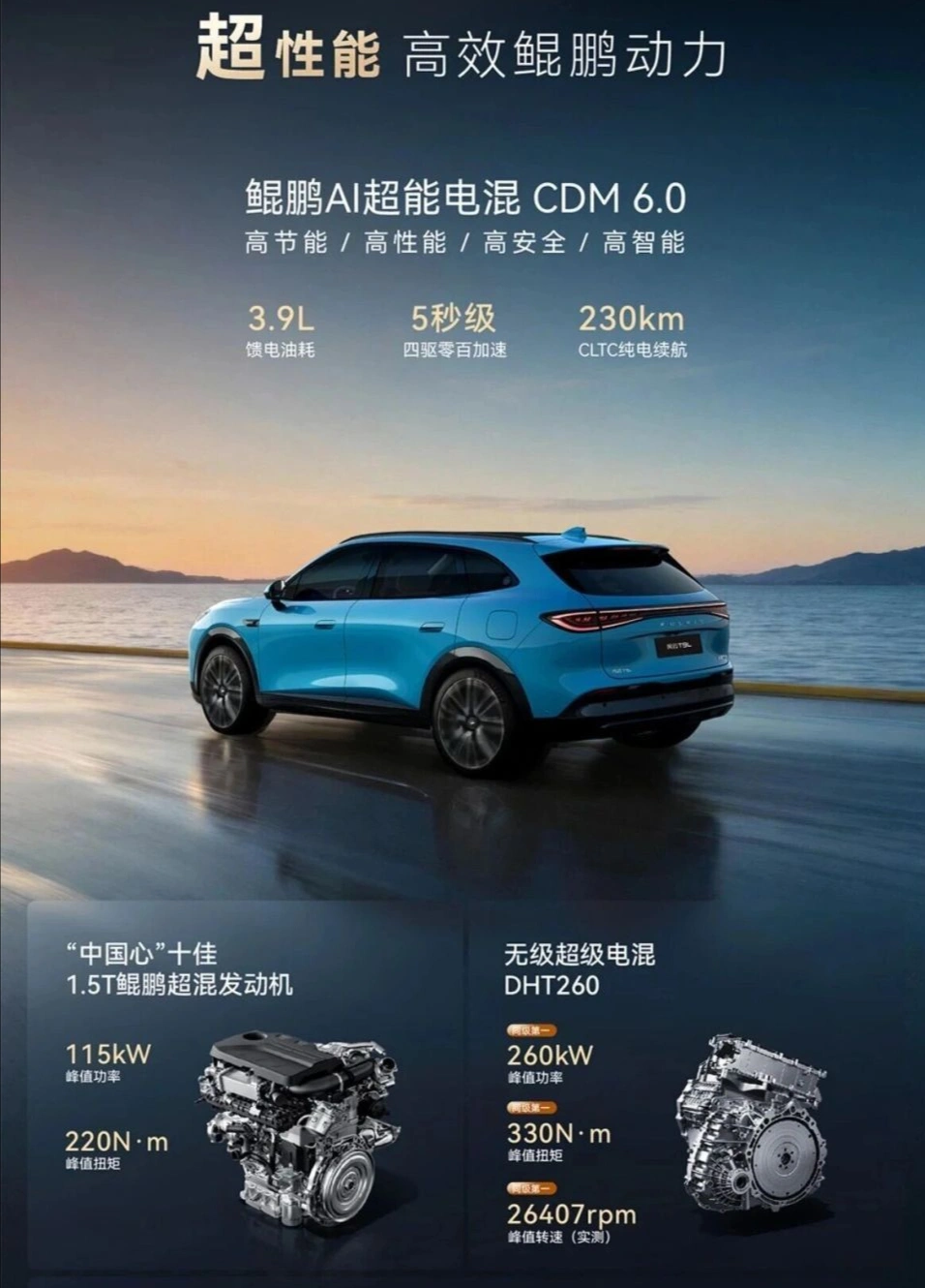 光有样子可不行,核心还得看“内功”。它搭载的鲲鹏超能电混C-DM系统是重头戏,1.5T发动机热效率很高,配合电机,四驱版百公里加速能跑进5秒内。更关键的是油耗,官方馈电油耗能低至百公里3.9升,综合续航据说能超过1400公里。对于咱北方的老铁,冬季续航是硬指标。根据一些信息,其电池智能温控系统在低温下表现不错,有案例显示在零下5度的环境里,纯电续航达成率还能有80%左右,这比很多电动车冬天动辄对折的续航要扎实得多,混动结构本身也让它没有纯电车的里程焦虑。