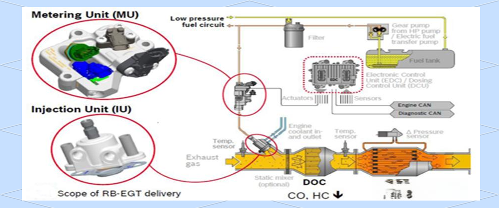 当需要激活DPM主动再生时,系统会负责将燃油精准喷入排气管。这一过程依赖于DPM系统的多个组件,包括一个MU(管理单元)、一个IU(执行单元)以及连接的油管。在MU上,我们集成了关闭阀(SV阀)、比例阀(DV阀),同时配备了下游压力传感器和上游压力温度传感器,以确保对再生过程的精准控制。