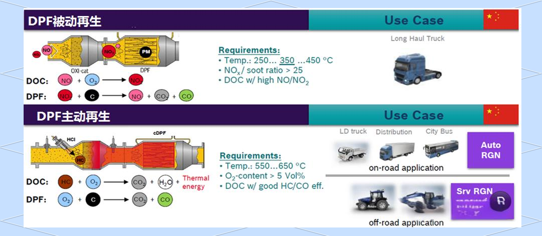 1、DOC将废气中的NO转化为NO2,当废气温度超过300℃时,NO2能有效地促进DPF捕集到的颗粒的再生,即被动再生。