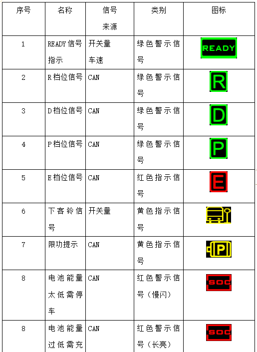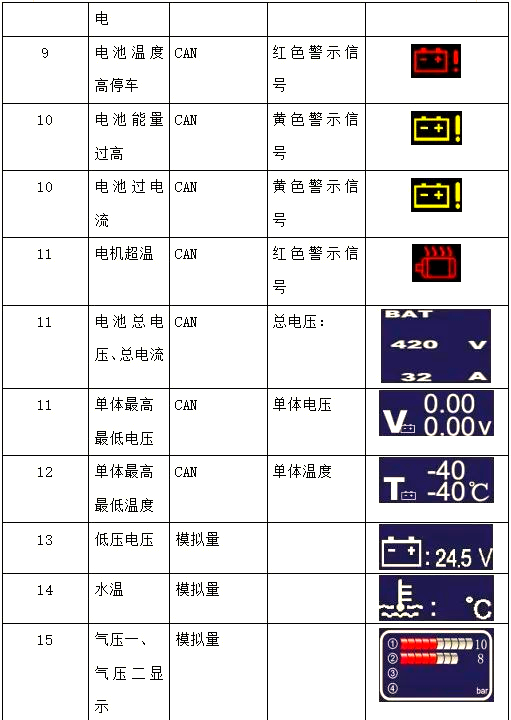 说明:所有通过CAN总线传输的报警信息,都应在仪表的报警界面上以文字或图标的方式呈现,以便驾驶员能够迅速了解并应对潜在问题。这些报警信息可能包括绝缘等级、BMS模块故障、地面充电机状态等。在无报警信号的情况下,仪表将显示厂家的Logo或相关标识。