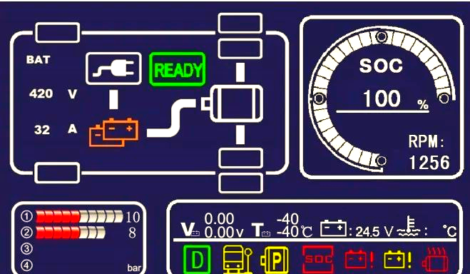 1、主界面左上角清晰地展示了电池的总电压、总电流、充电状态、电机状态以及READY信号灯,为用户提供全面的电池和电机信息。