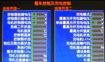 电机界面汇集了各类关键数据,这些数据均由电机节点经由CAN总线传输至仪表。界面内容广泛,包括主机实时转速、主电机转矩、母线电压、电机及控制器温度、最大允许充电电流、单体电池最高电压以及故障代码等。通过这些数据,可以直观地了解车辆的电机工作状态。