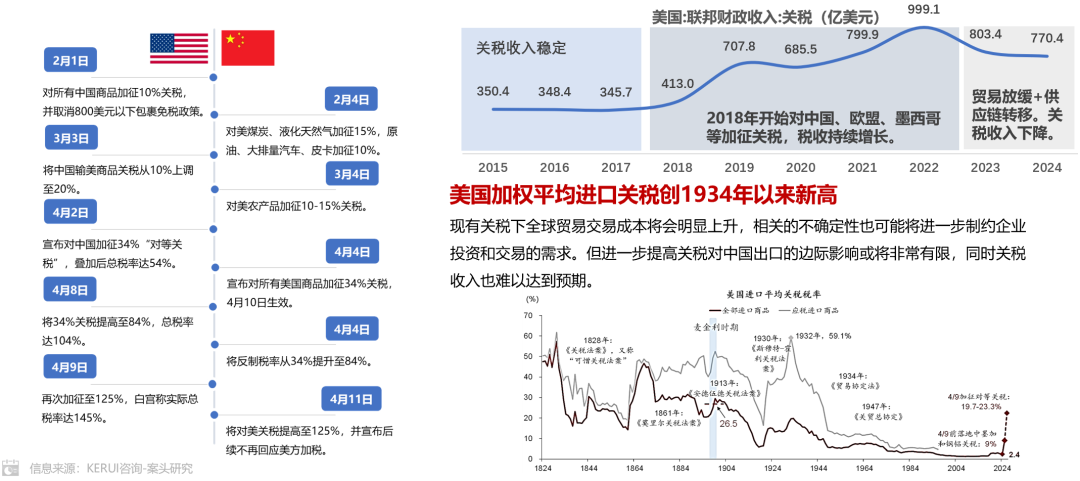 自2月初以来,中美之间就开始了新一轮关税博弈。两国关税也从2月1日的加征10%到现在的总税率超过100%,目前美国对华商品实际总关税达145%,中国对美商品关税维持在125%,双方均表示贸易已实质性脱钩。美国加权平均进口关税也创下1934年以来新高。