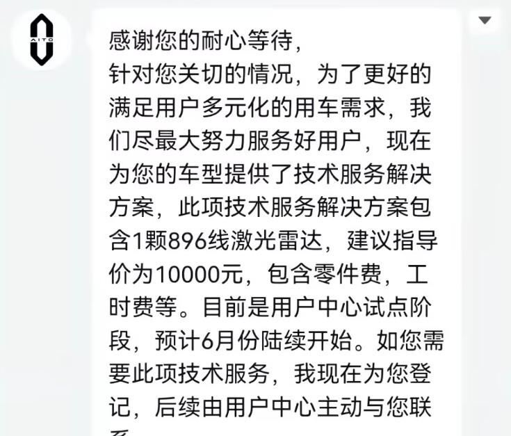 就在几天前,鸿蒙智行官方放出了一个消息:从2026年6月起,问界将在用户中心为新M7、M8以及2025款M9提供896线激光雷达的付费升级服务,费用1万块,含零件费和工时费。