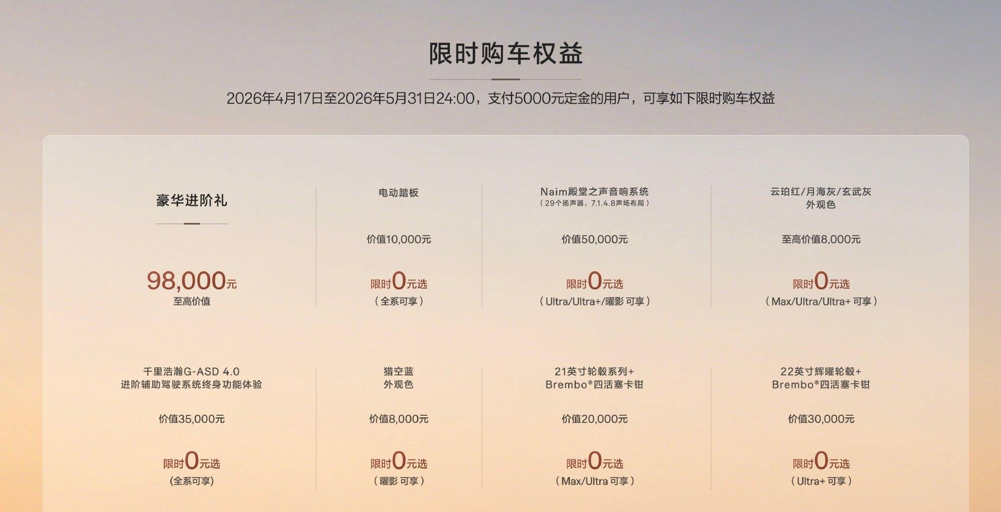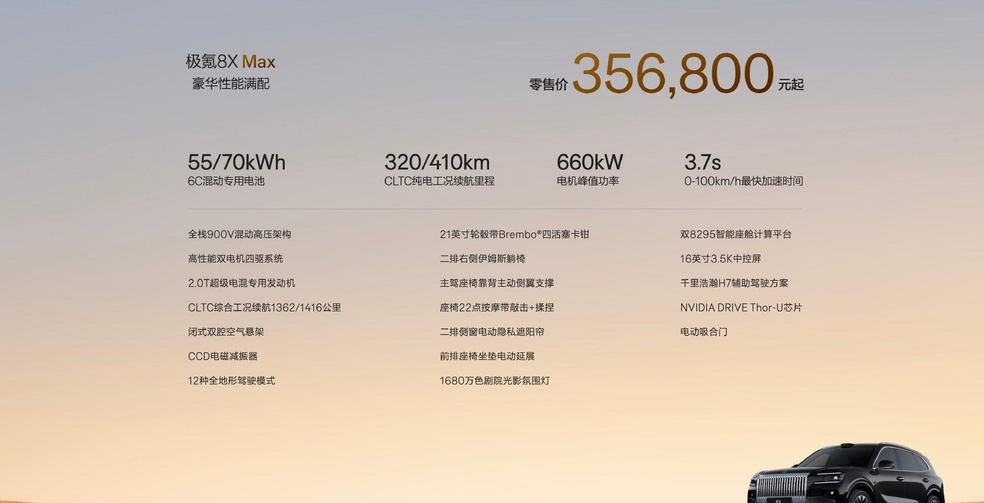 极氪8X这次一共推出了四个版本:Max版、Ultra版、Ultra+版,还有一个顶配的曜影版。官方公布的零售价是35.68万起,顶配曜影50.08万起。但你猜怎么着?极氪上来就给了2.7万的首发权益,算下来限时售价直接变成了32.98万到47.38万。