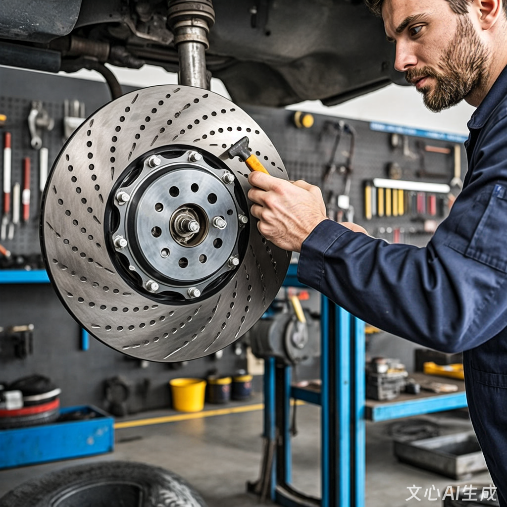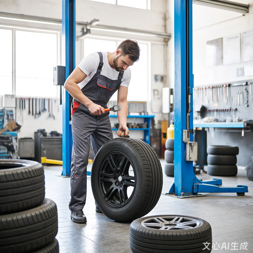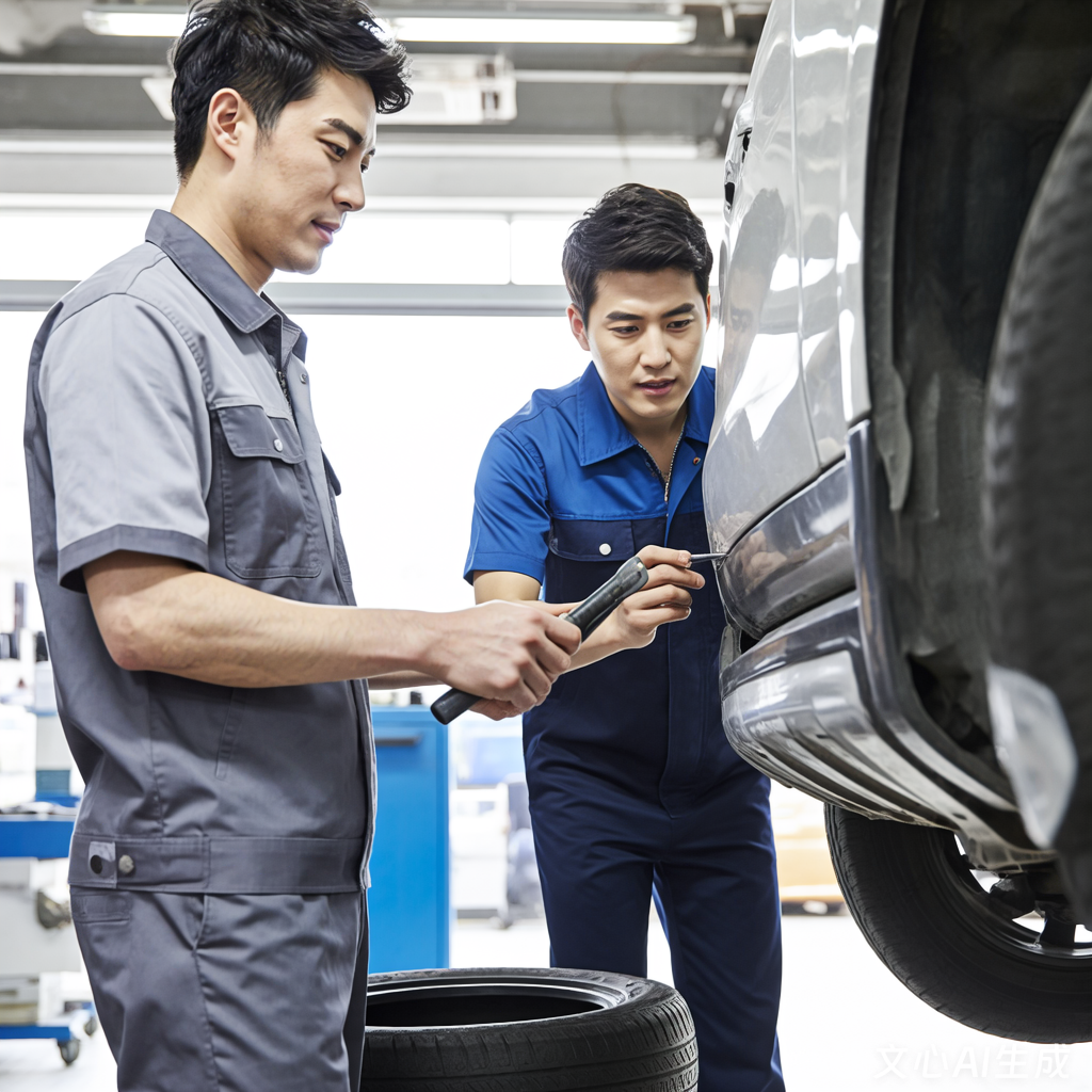 轮胎检查需每月用胎压计测量气压(标准值2.3-2.5bar),每2万公里轮胎换位,检查胎纹深度(低于1.6mm需更换)及磨损情况。刹车系统则检查刹车片厚度(<3mm需更换)、刹车盘磨损,每2年或4万公里更换刹车油。如上图所示,技师在维修车间检查轮胎气压和磨损情况,确保行车安全。
