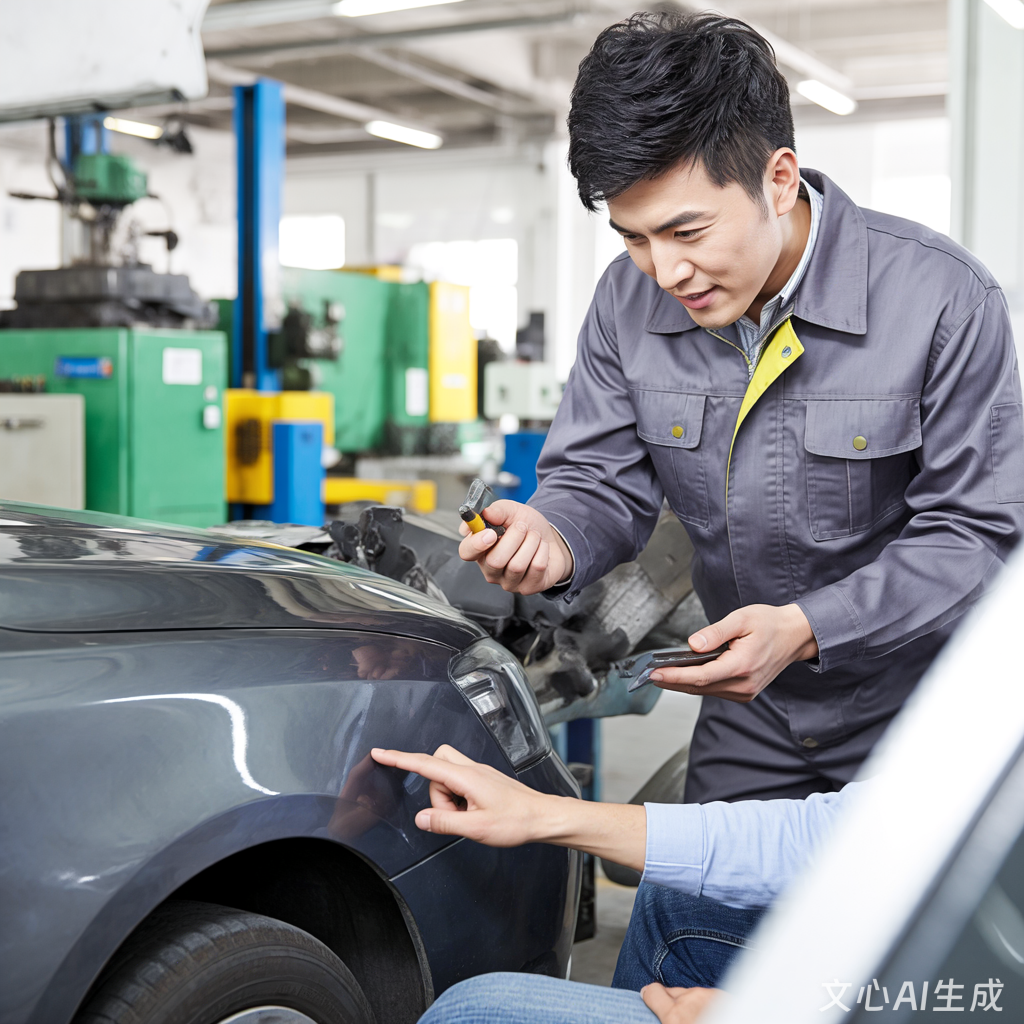 保养流程始于接车环节。技师会热情迎接车主,仔细询问用车感受,如车辆有无异常声响、动力变化等,并核对车架号、行驶里程等车辆信息。同时,对车辆外观进行细致检查,查看是否有划痕、凹陷,灯光装置是否损坏,轮胎外表及漏油、漏水情况。如上图所示,技师与车主在维修车间进行接车问诊和外观检查,确保后续保养有的放矢。