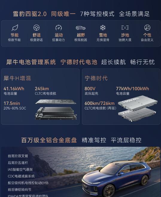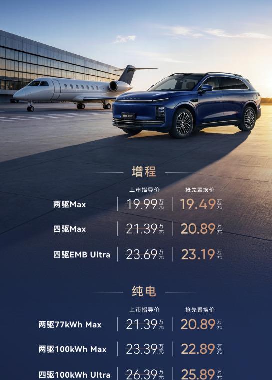 增程两驱Max:19.99万(置换价19.49万)增程四驱Max:21.99万(置换价21.49万)增程四驱EMB Ultra:24.39万(置换价23.89万)77kWh纯电两驱Max:21.39万(置换价20.89万)100kWh纯电两驱Max:23.39万(置换价22.89万)100kWh纯电四驱Ultra:26.39万(置换价25.89万)