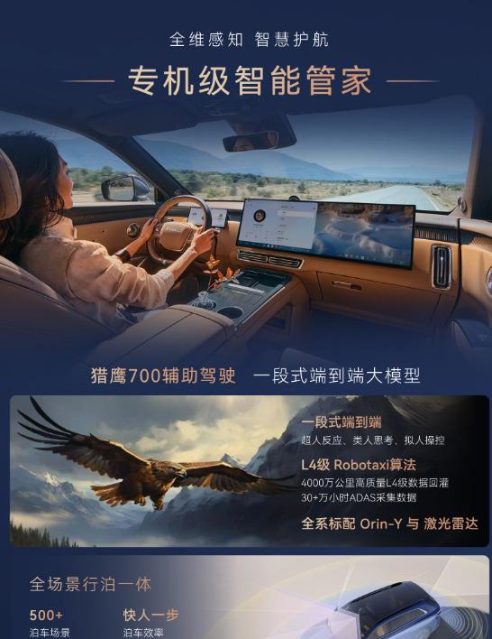 硬件配置很猛:27颗传感器,包括激光雷达,配上英伟达Orin-Y芯片。支持城市NOA、高速NOA,而且城市NOA终身免费。你在城里开车,它能帮你自动跟车、变道、过红绿灯。泊车方面更夸张,支持500多种泊车场景,3公里跨层记忆泊车,120米循迹倒车。