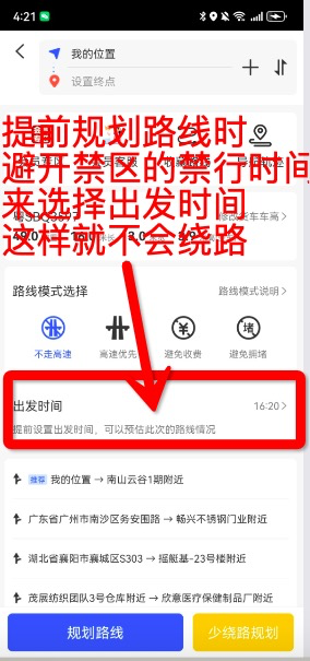 3、限时禁区,避开限行时间走,就不是禁区了,100%没事!设置出发时间可以规划更准确的路线,不会绕路!非要在禁行时间走,路线避开了电子眼就可以走,如果经过电子眼就得去12123申请通行证,严格按照通行证的路线和时间走!