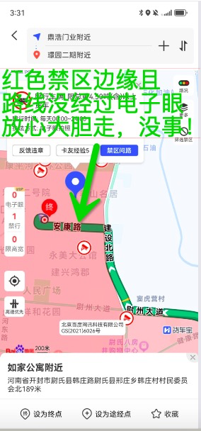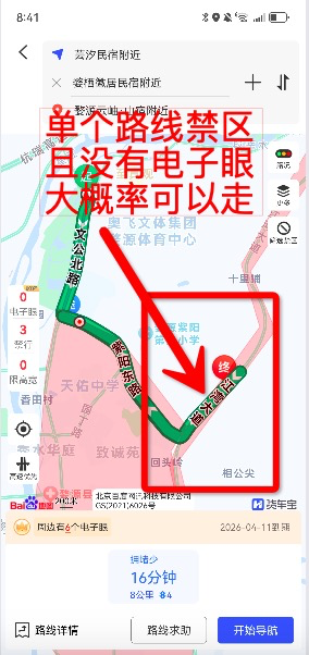 2、红色禁区的边缘,单个路线的红色禁区且没有电子眼的,只要路线没有经过电子眼,避开早晚高峰期可以走,大概率没事。
