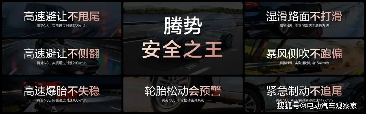 主动安全方面,得益于易三方,腾势N8L能够以128km/h高速避让不甩尾、210km/h高速避让(鱼钩测试)不侧翻、180km/h高速爆胎不失稳、154km/h暴风侧吹不跑偏、147km/h AEB自动紧急制动、不怕雨雪路面打滑、车轮松动监测系统,以科技安全守护家人出行安心。
