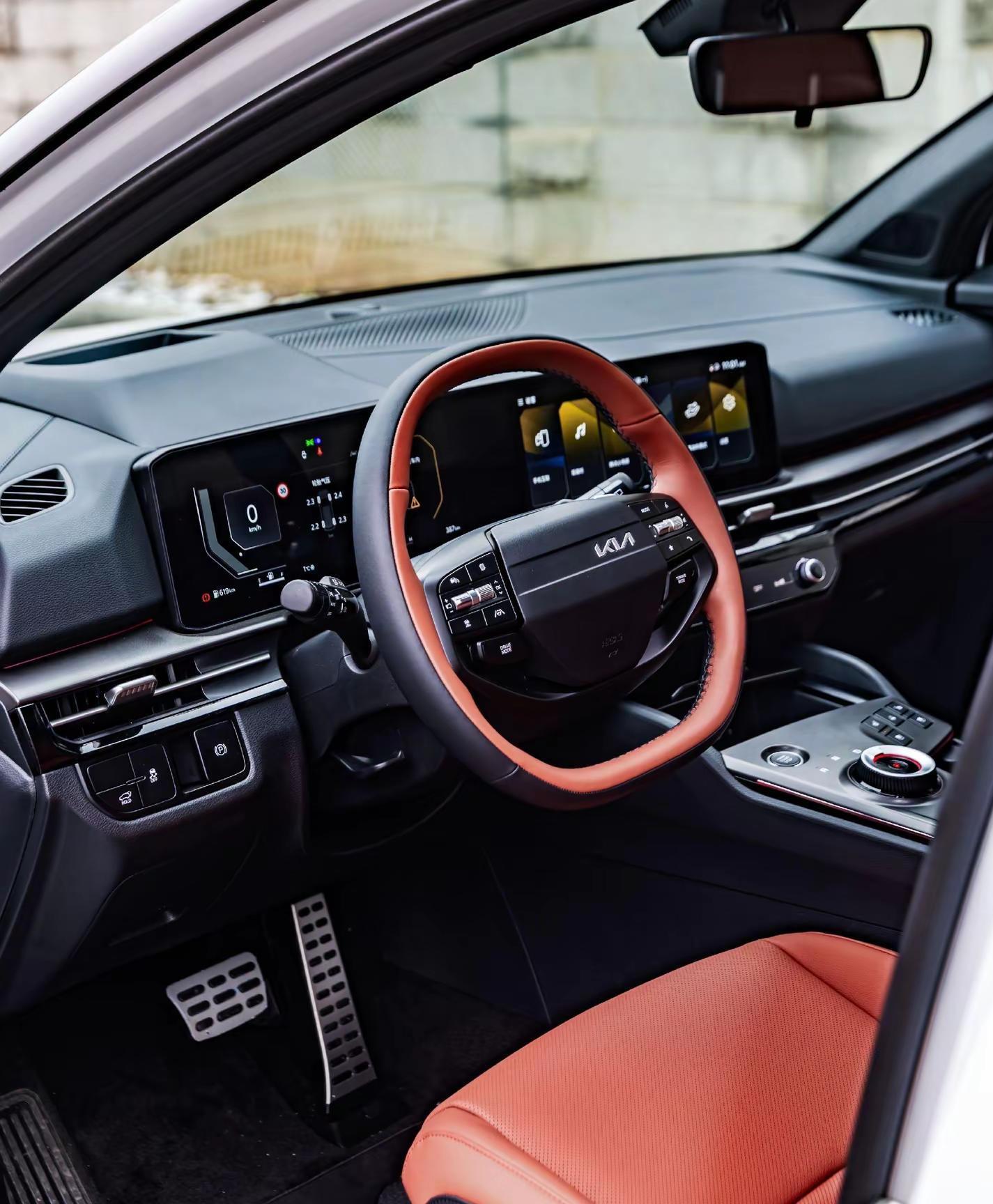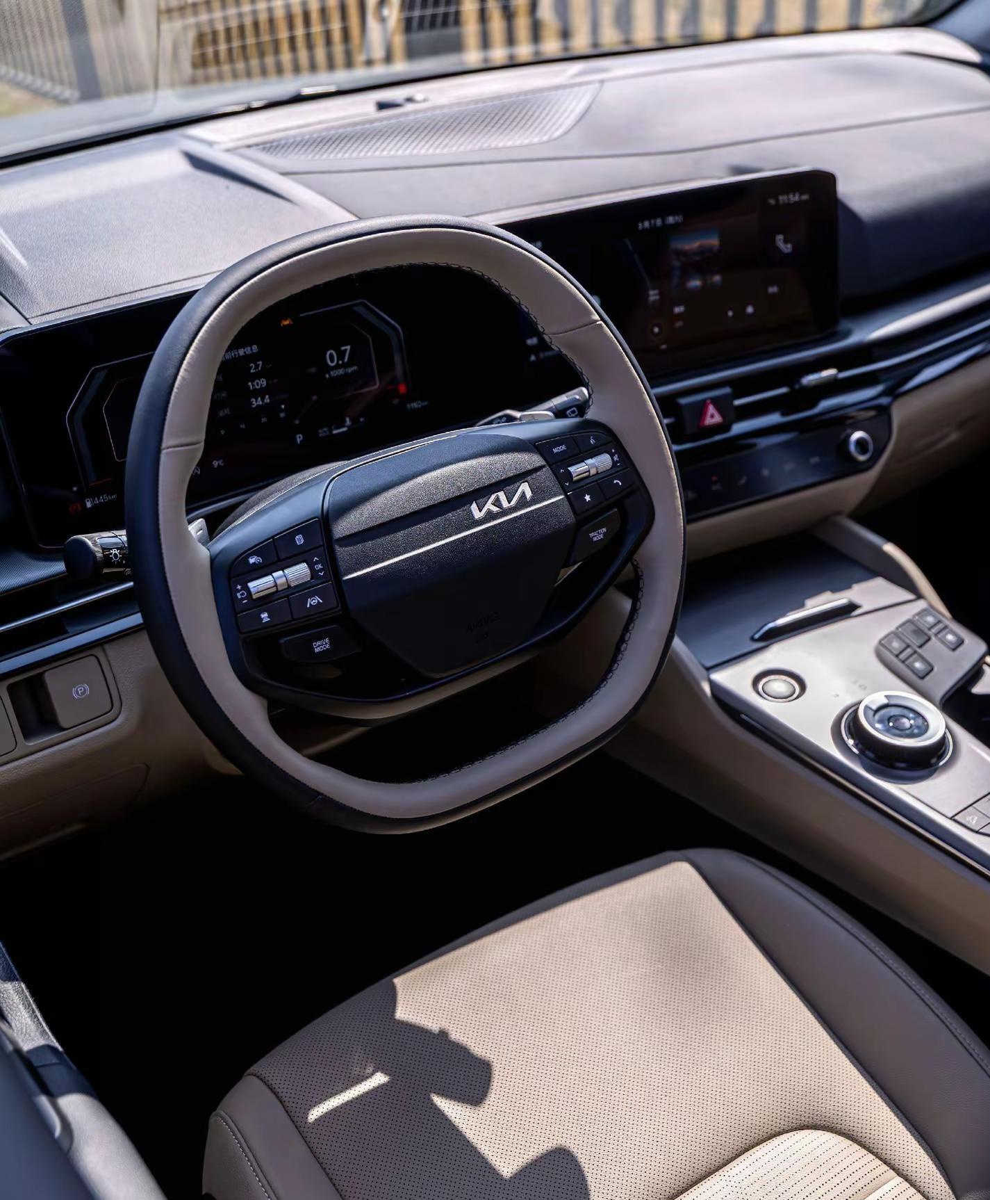 先说说这个让强迫症患者抓狂的方向盘。新款狮铂拓界换了个双辐平底两幅方向盘,复古感拉满,握感也挺舒服,但那个车标偏偏不居中,偏右设计。有人觉得这设计有个性,“不对称才是美”,也有人直接破防:“起亚的设计师是不是跟强迫症有仇?”说实话,要是搁几年前,我也觉得这是吃饱了撑的挑毛病。但现在10万出头的车,能把内饰质感做到这份上,还真得服。中控台换成了环绕式布局,双12.3英寸曲面屏终于把那个不规则的切割改成了方正的长方形,看着顺眼多了。贯穿式空调出风口、木纹和金属拉丝饰板,该软的地方软,该亮的地方亮,跟老款那种“能开就行”的塑料感完全不是一个时代的东西。