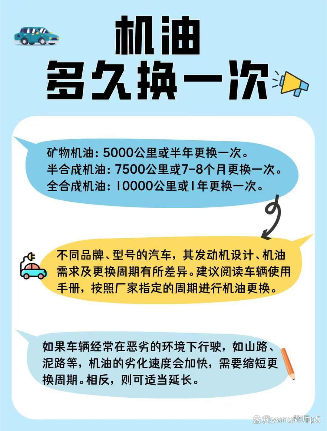 第一点,根据使用的机油类型来确定更换周期。矿物油5000公里,半合成7500公里,全合成1万公里,这个是基础。